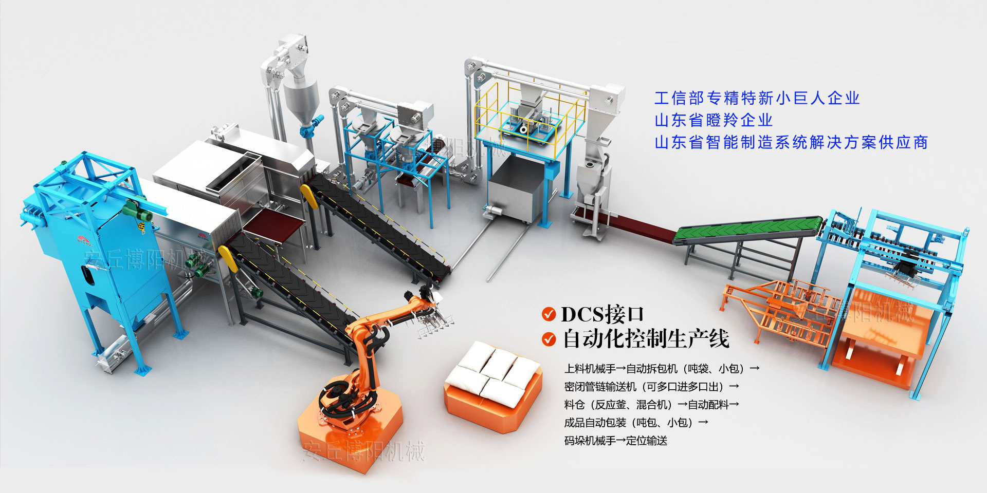 全自動(dòng)拆包投料生產(chǎn)線噸袋拆包機(jī)+自動(dòng)拆包機(jī)+智能拆包機(jī)+拆包機(jī)器人→管鏈輸送機(jī)→反應(yīng)釜投料機(jī)器人+料倉(cāng)